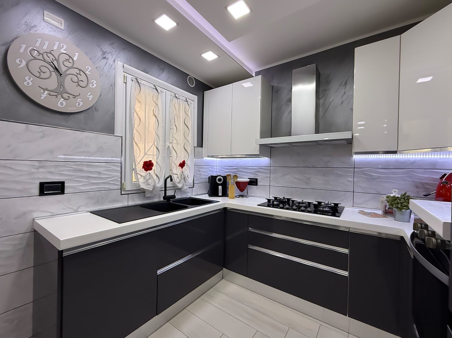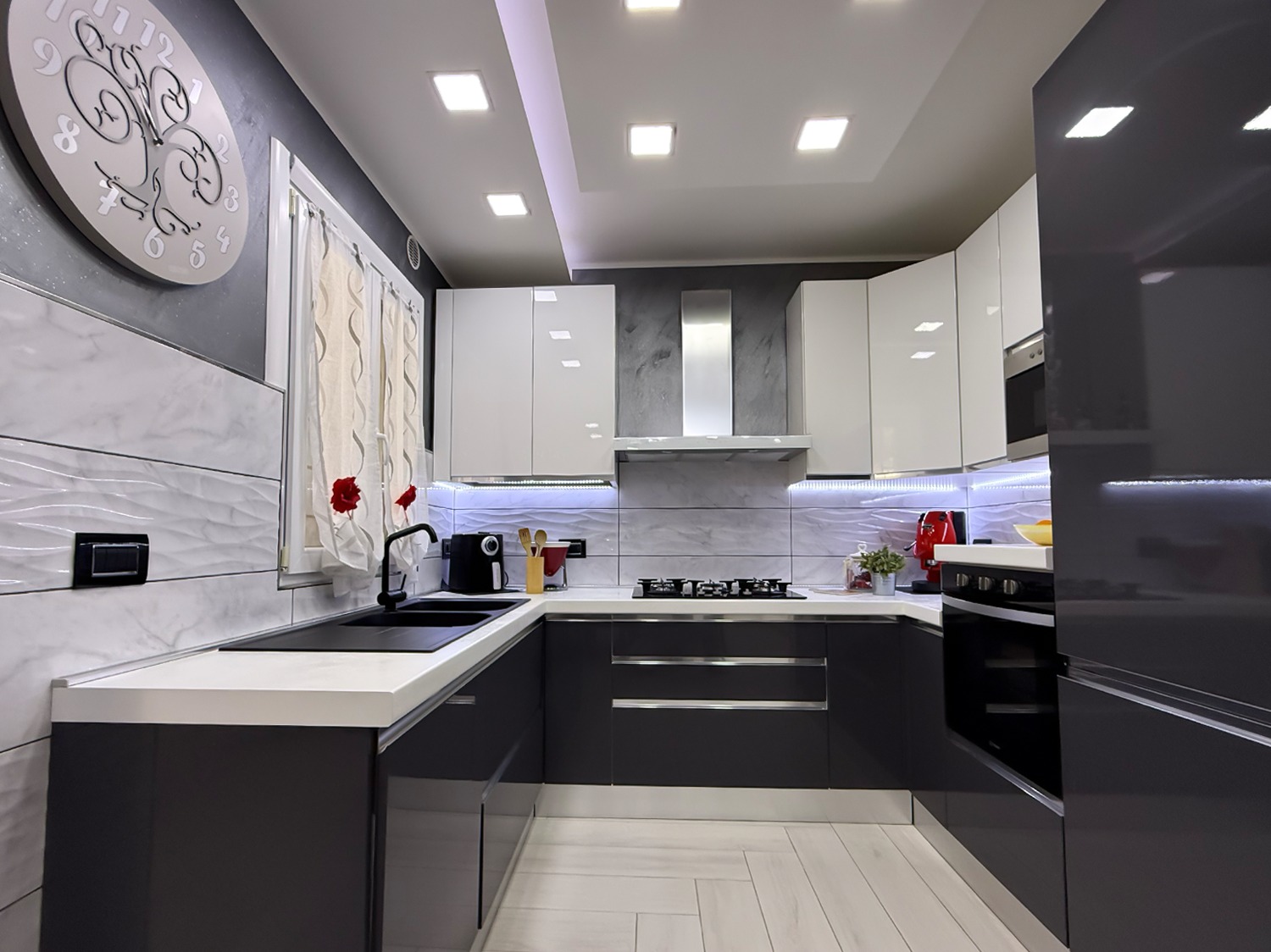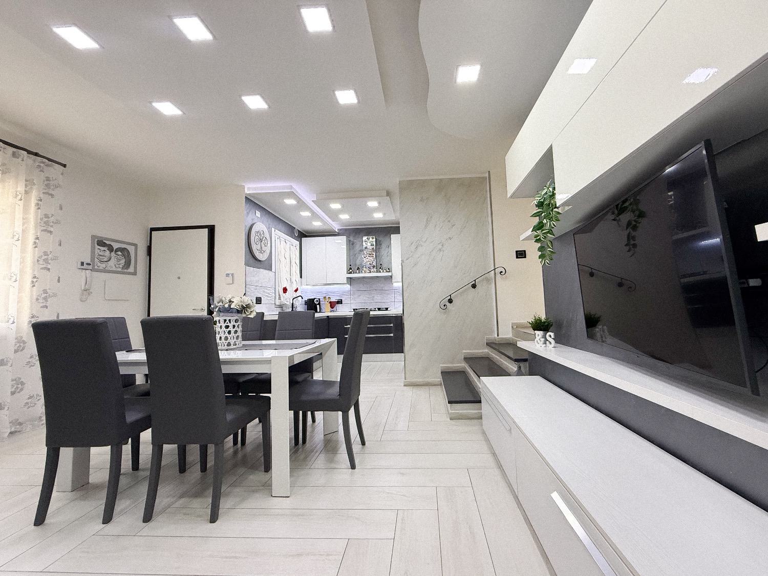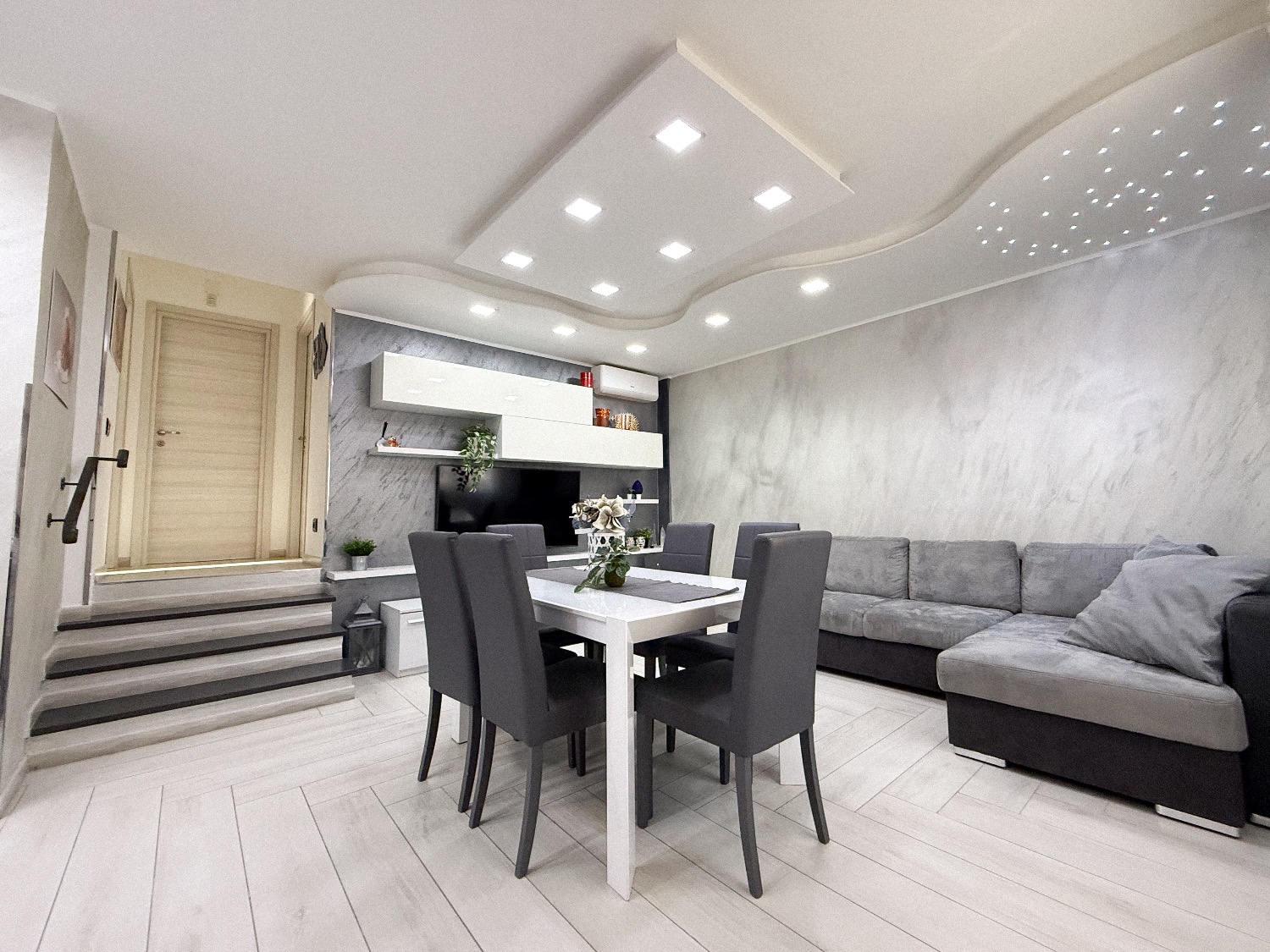 L’abitazione si apre su un accogliente giardino privato, curato e ben attrezzato, ideale per pranzi all’aperto, momenti di relax o per far giocare i bambini in totale sicurezza. Entrando, si viene accolti da una zona giorno luminosa e moderna, con soggiorno e sala da pranzo dal design raffinato, soffitti con illuminazione a LED e finiture contemporanee. La cucina, separata ma in continuità con l’ambiente principale, è completamente attrezzata e caratterizzata da uno stile elegante.