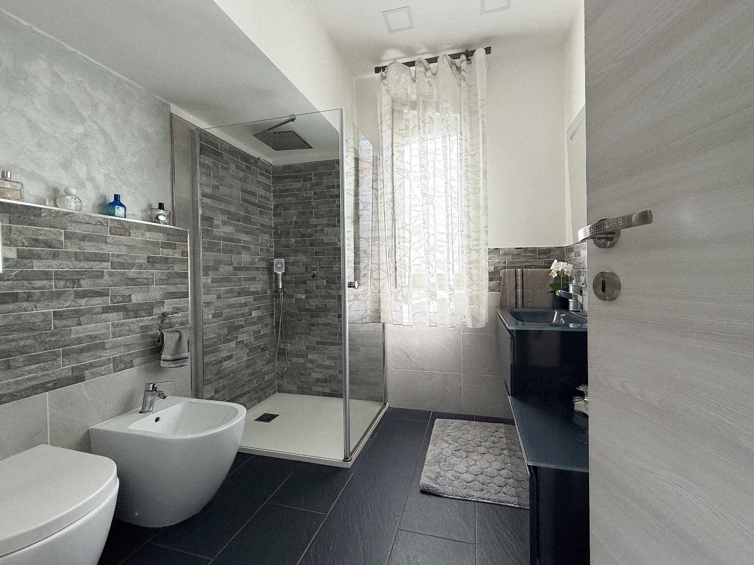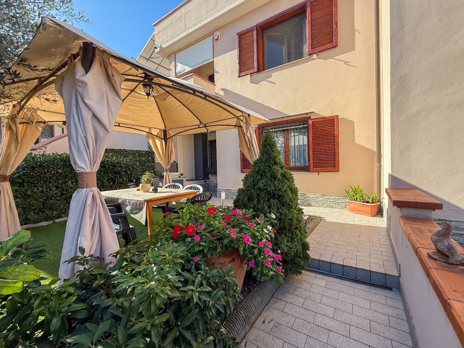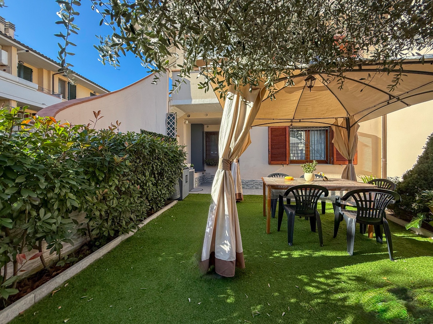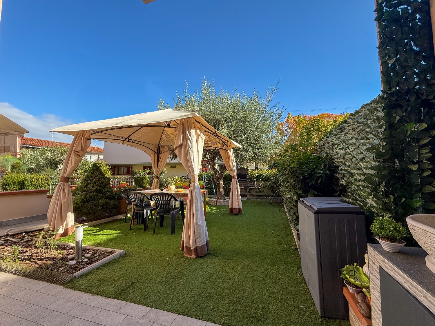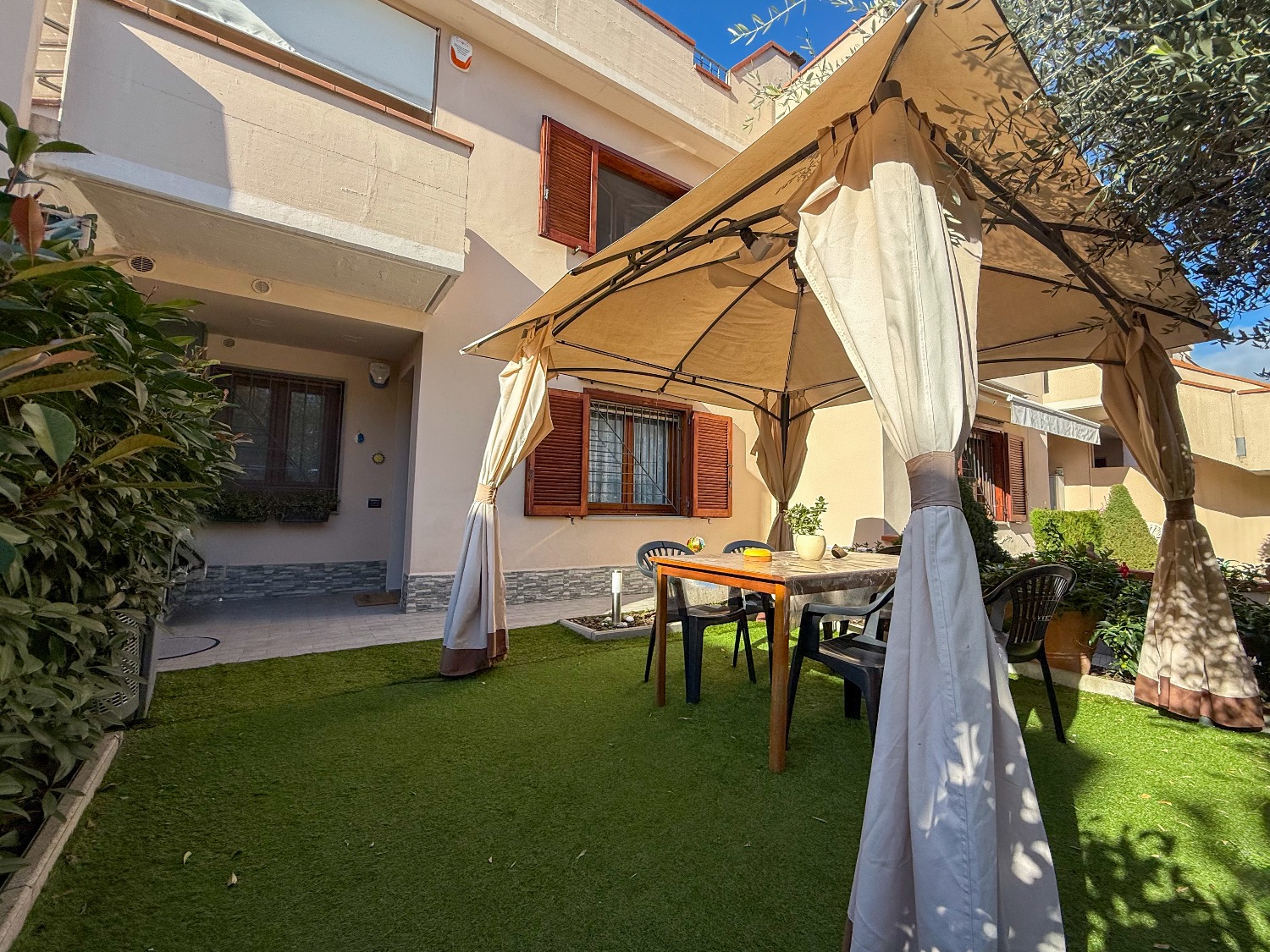 L’abitazione si apre su un accogliente giardino privato, curato e ben attrezzato, ideale per pranzi all’aperto, momenti di relax o per far giocare i bambini in totale sicurezza. Entrando, si viene accolti da una zona giorno luminosa e moderna, con soggiorno e sala da pranzo dal design raffinato, soffitti con illuminazione a LED e finiture contemporanee. La cucina, separata ma in continuità con l’ambiente principale, è completamente attrezzata e caratterizzata da uno stile elegante.