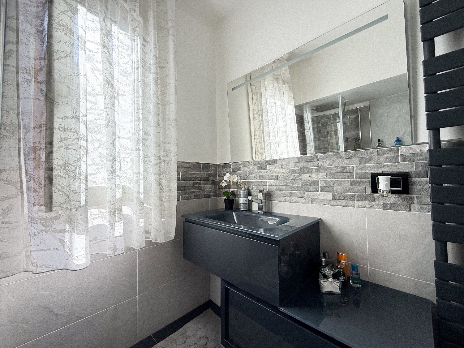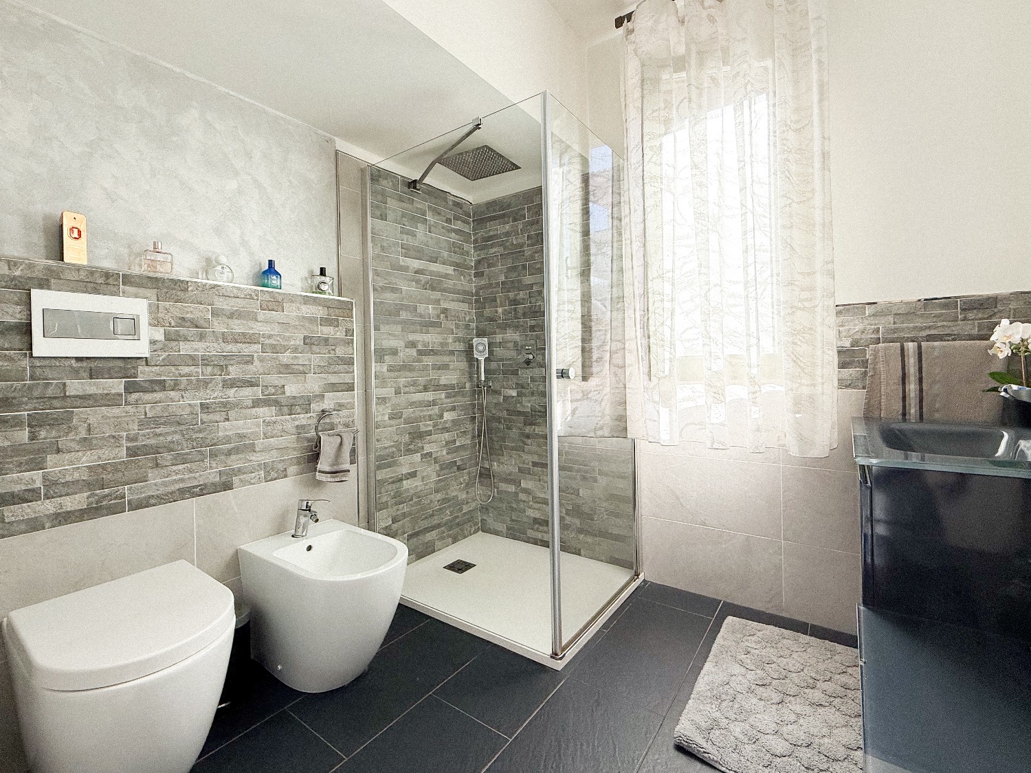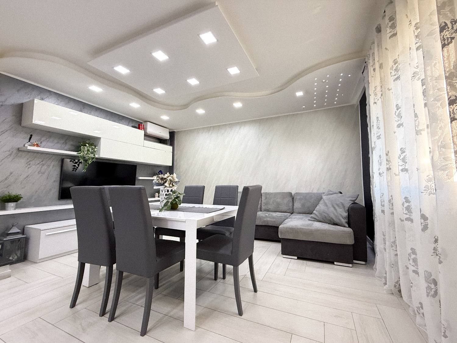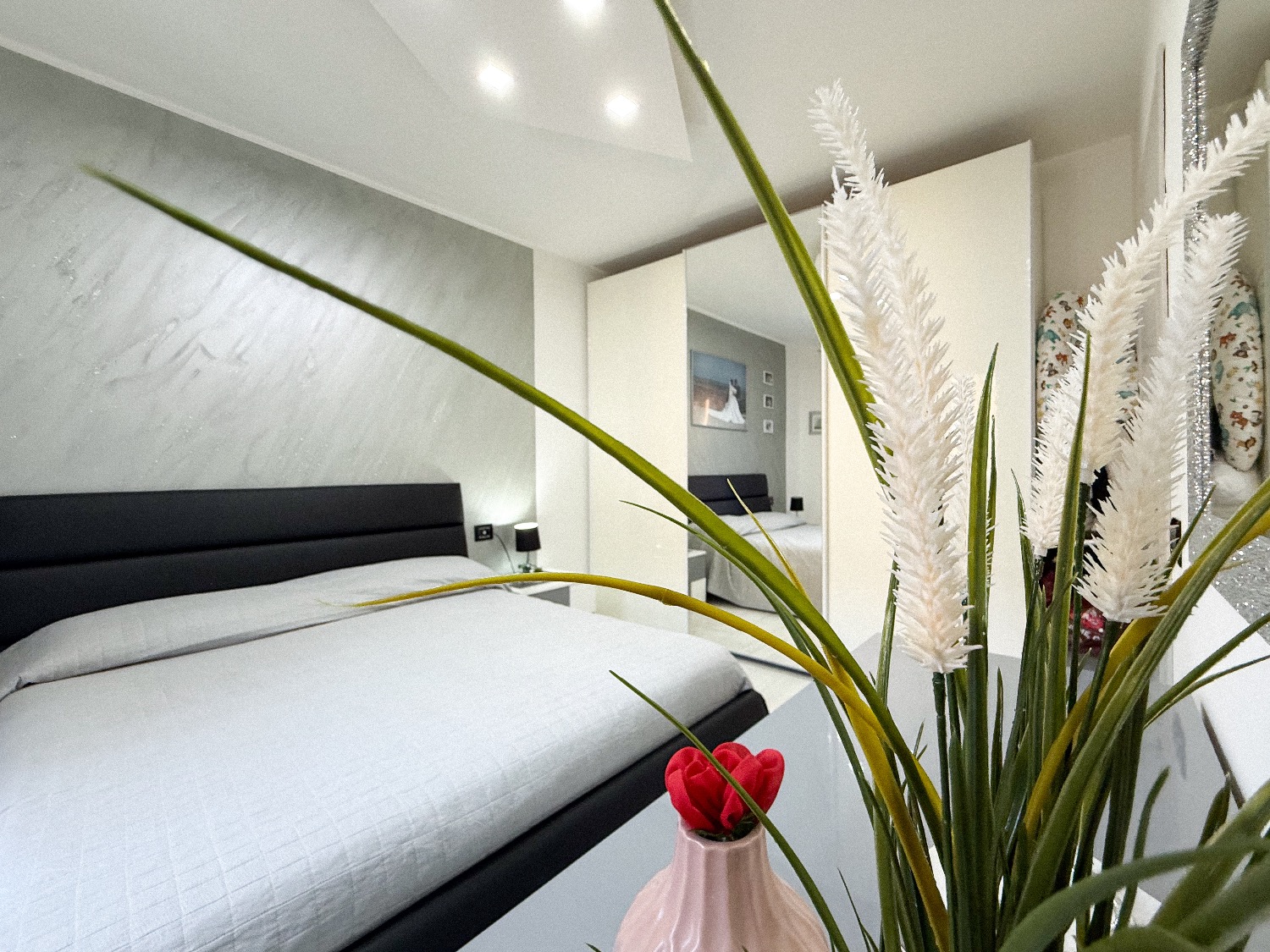 L’abitazione si apre su un accogliente giardino privato, curato e ben attrezzato, ideale per pranzi all’aperto, momenti di relax o per far giocare i bambini in totale sicurezza. Entrando, si viene accolti da una zona giorno luminosa e moderna, con soggiorno e sala da pranzo dal design raffinato, soffitti con illuminazione a LED e finiture contemporanee. La cucina, separata ma in continuità con l’ambiente principale, è completamente attrezzata e caratterizzata da uno stile elegante.