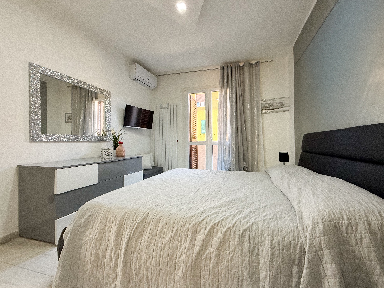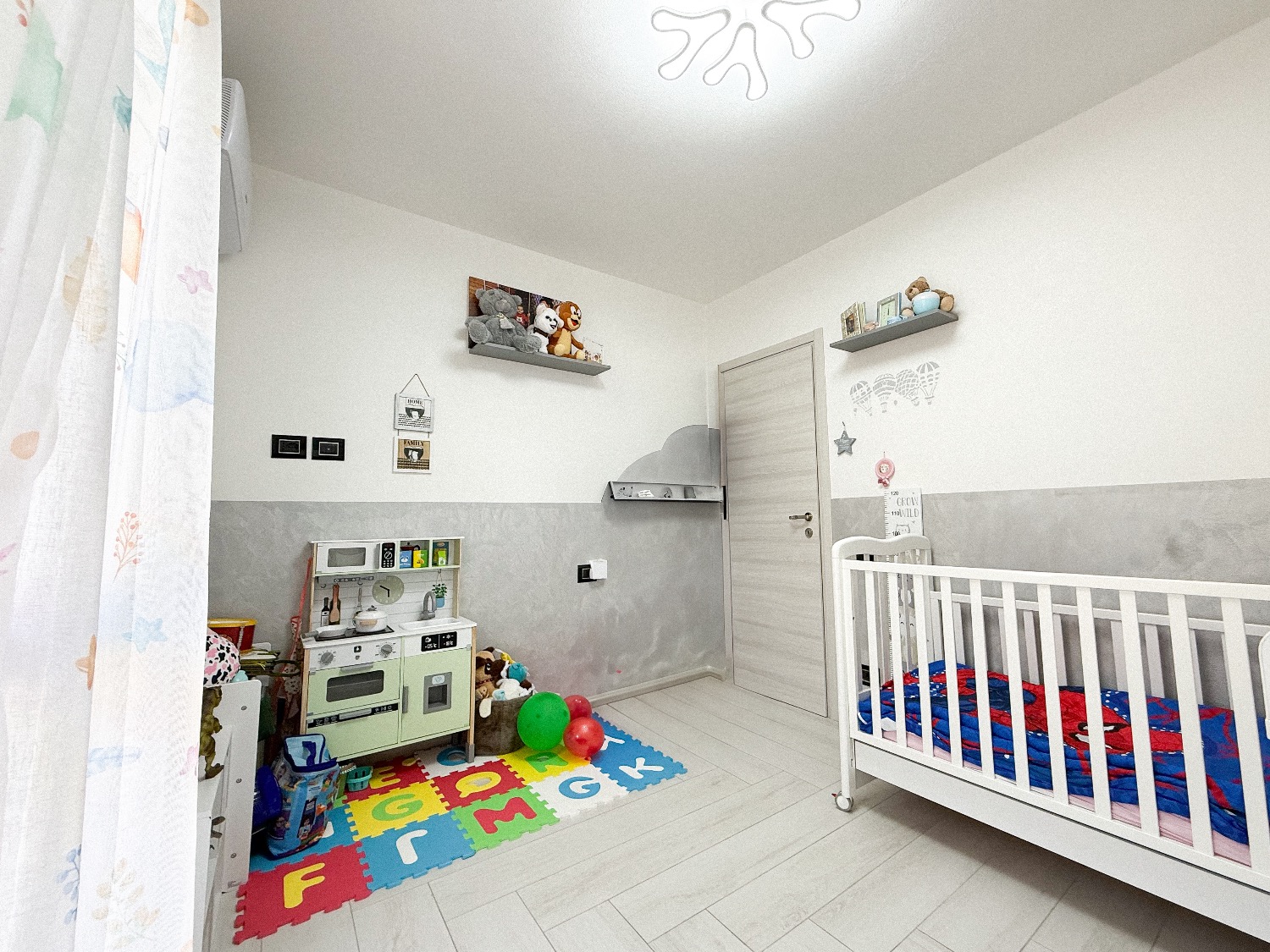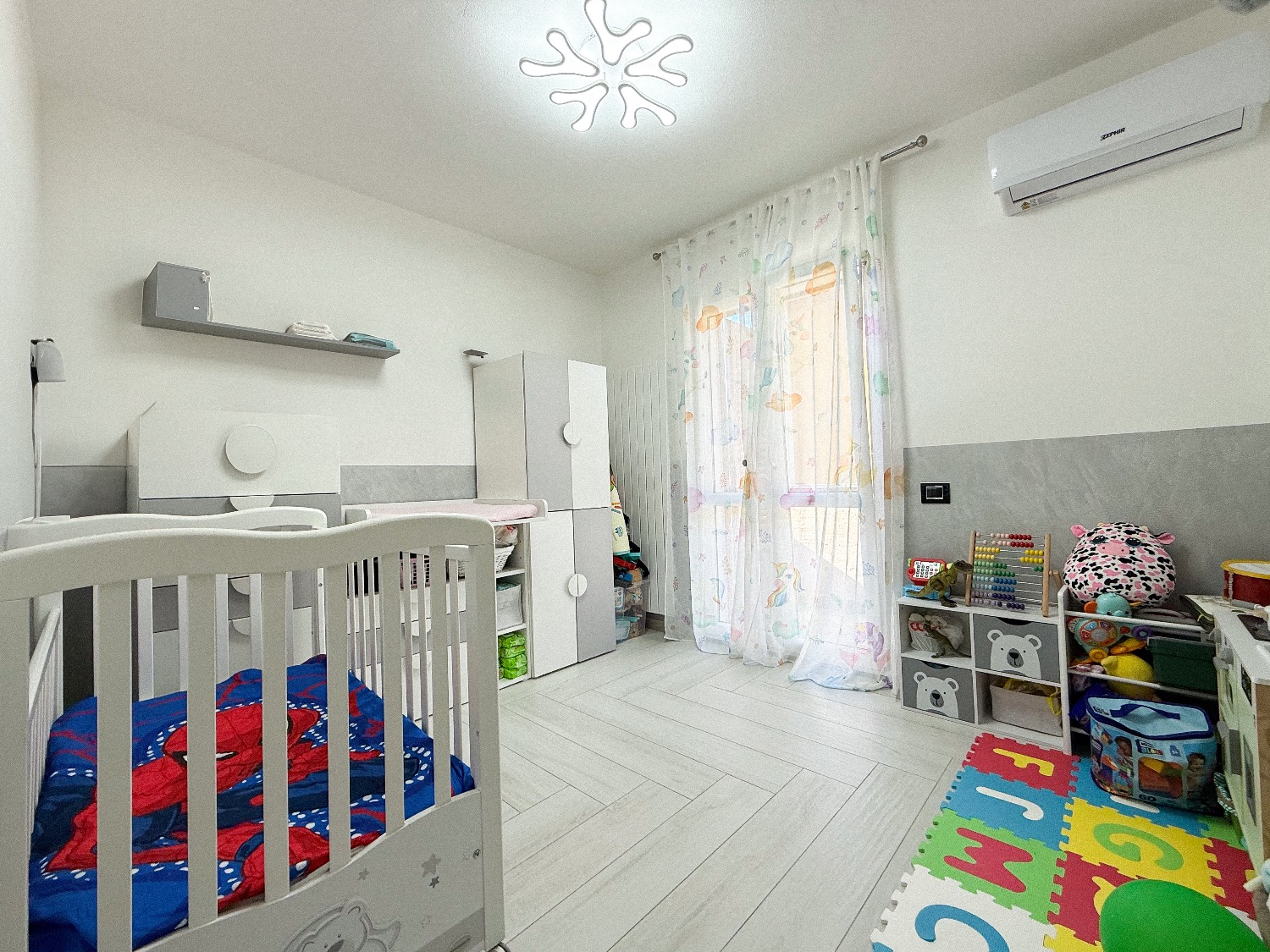 La zona notte ospita due camere spaziose: una matrimoniale e una cameretta ideale per bambini o come studio. Il bagno finestrato, con doccia a filo pavimento e rivestimenti effetto pietra, completa la zona notte con gusto e funzionalità.