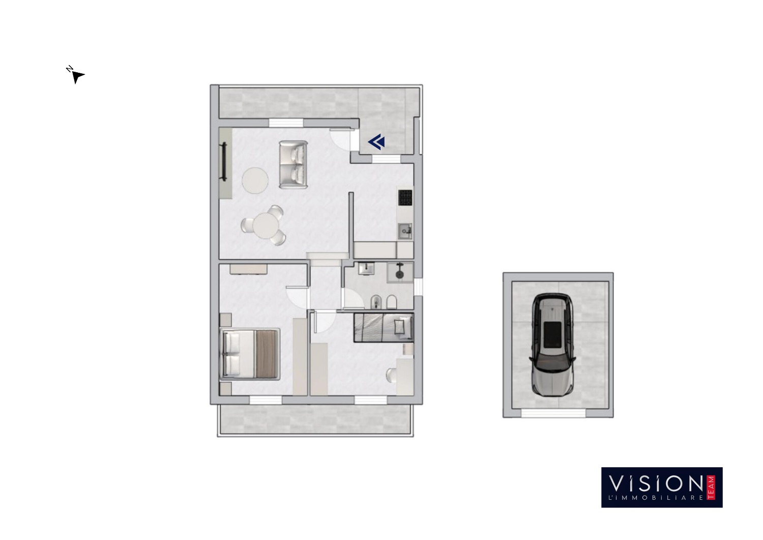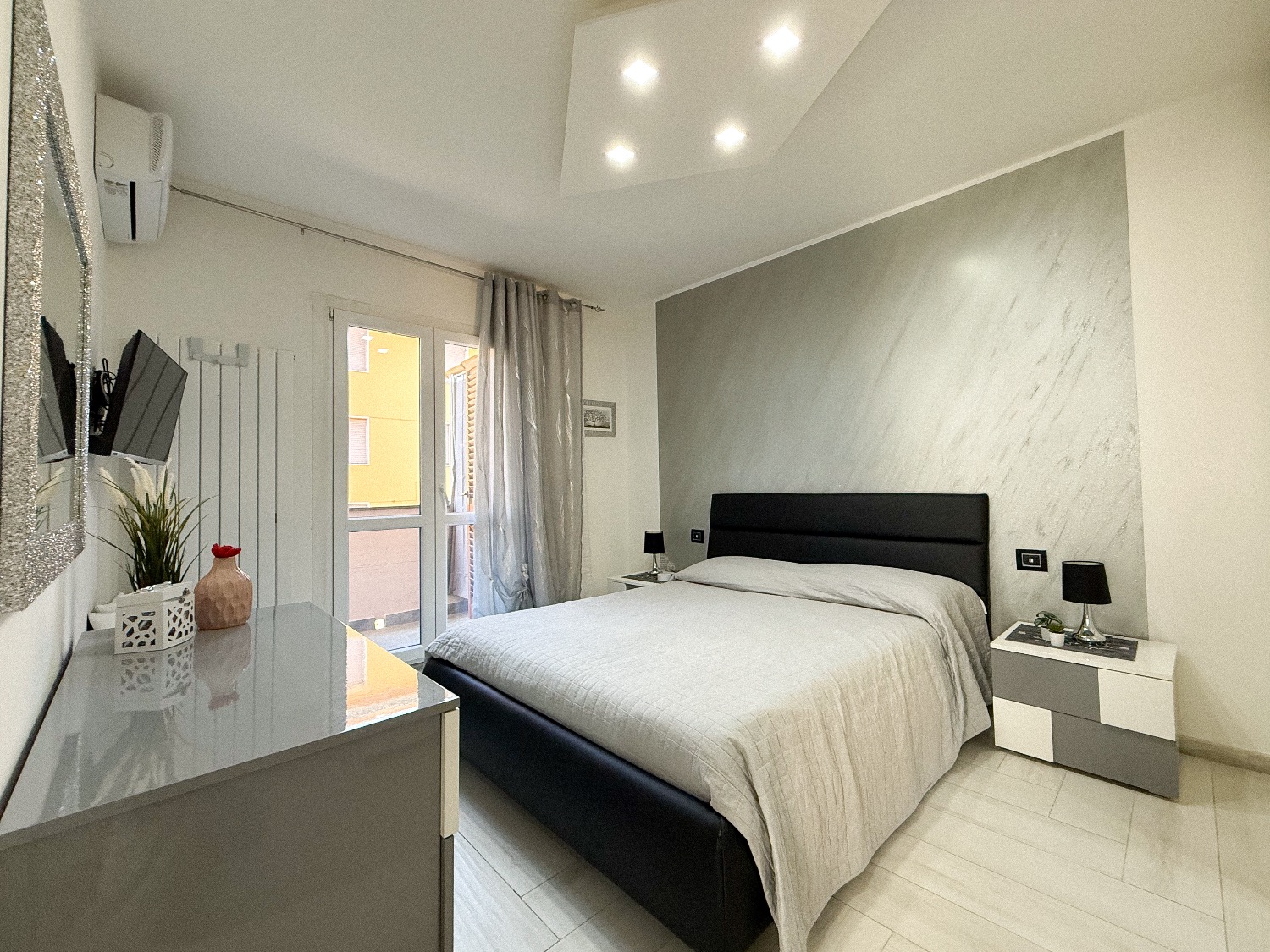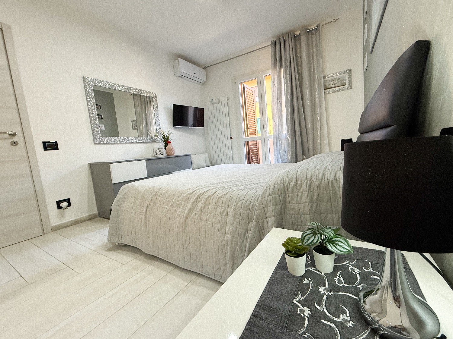 La zona notte ospita due camere spaziose: una matrimoniale e una cameretta ideale per bambini o come studio. Il bagno finestrato, con doccia a filo pavimento e rivestimenti effetto pietra, completa la zona notte con gusto e funzionalità.