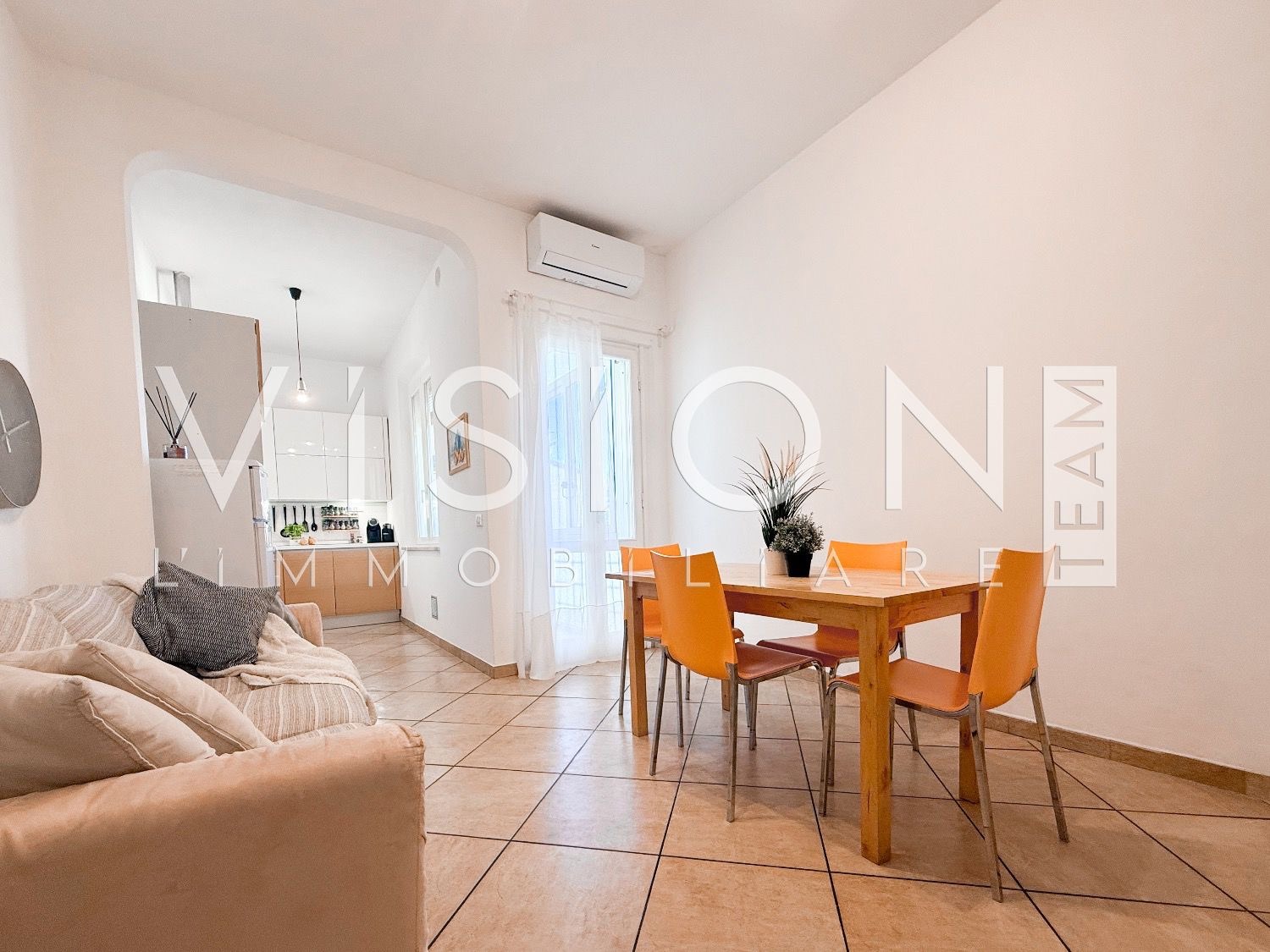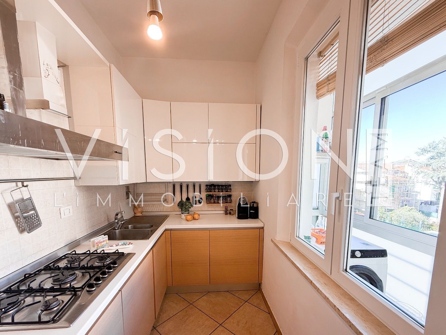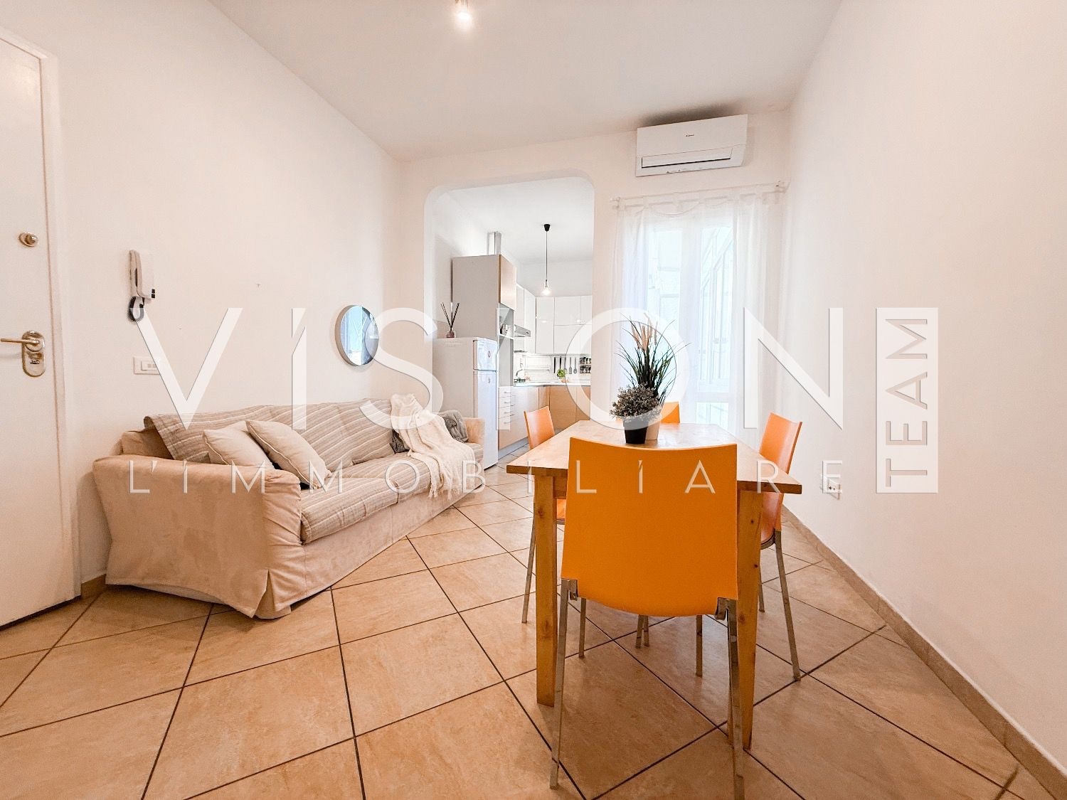 L’abitazione si distingue per la chiara divisione tra zona giorno e zona notte: l’ingresso si apre su una confortevole zona giorno con angolo cottura e accesso alla terrazza riservata, dotata di zona lavanderia e affaccio sulla corte interna condominiale.