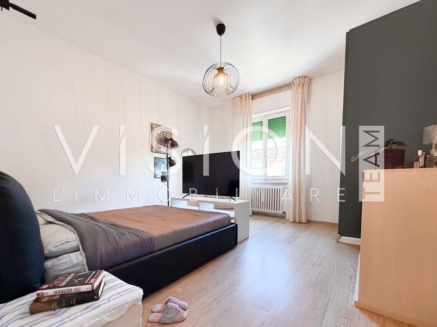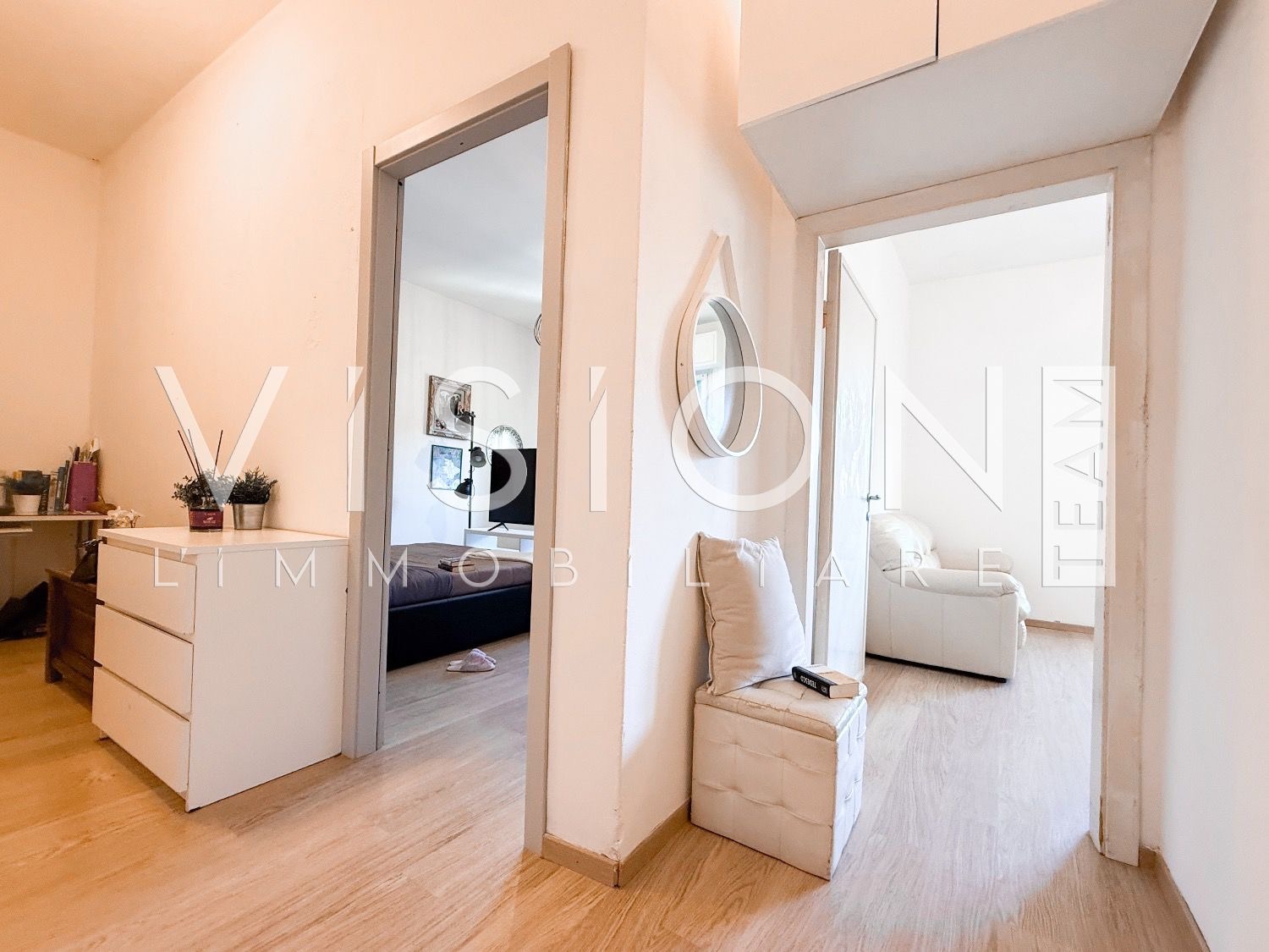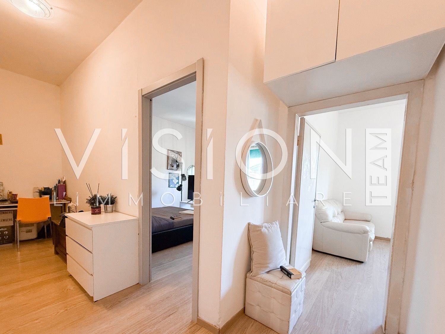 Un disimpegno collega in modo funzionale la zona notte, composta da due camere matrimoniali, un bagno finestrato e un comodo ripostiglio.