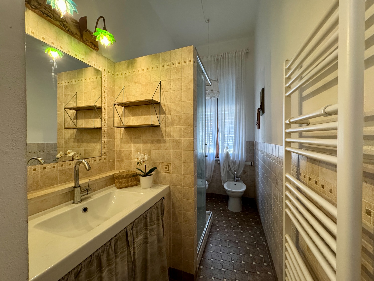 La zona notte è composta da due camere matrimoniali, entrambe di dimensioni generose, silenziose e adatte a garantire comfort e privacy. Gli spazi consentono una gestione versatile dell’arredo, rendendo l’immobile adatto sia a nuclei familiari sia a chi desidera una stanza aggiuntiva per studio o ospiti. Il bagno, ben rifinito, è coerente con lo stato manutentivo generale dell’appartamento.