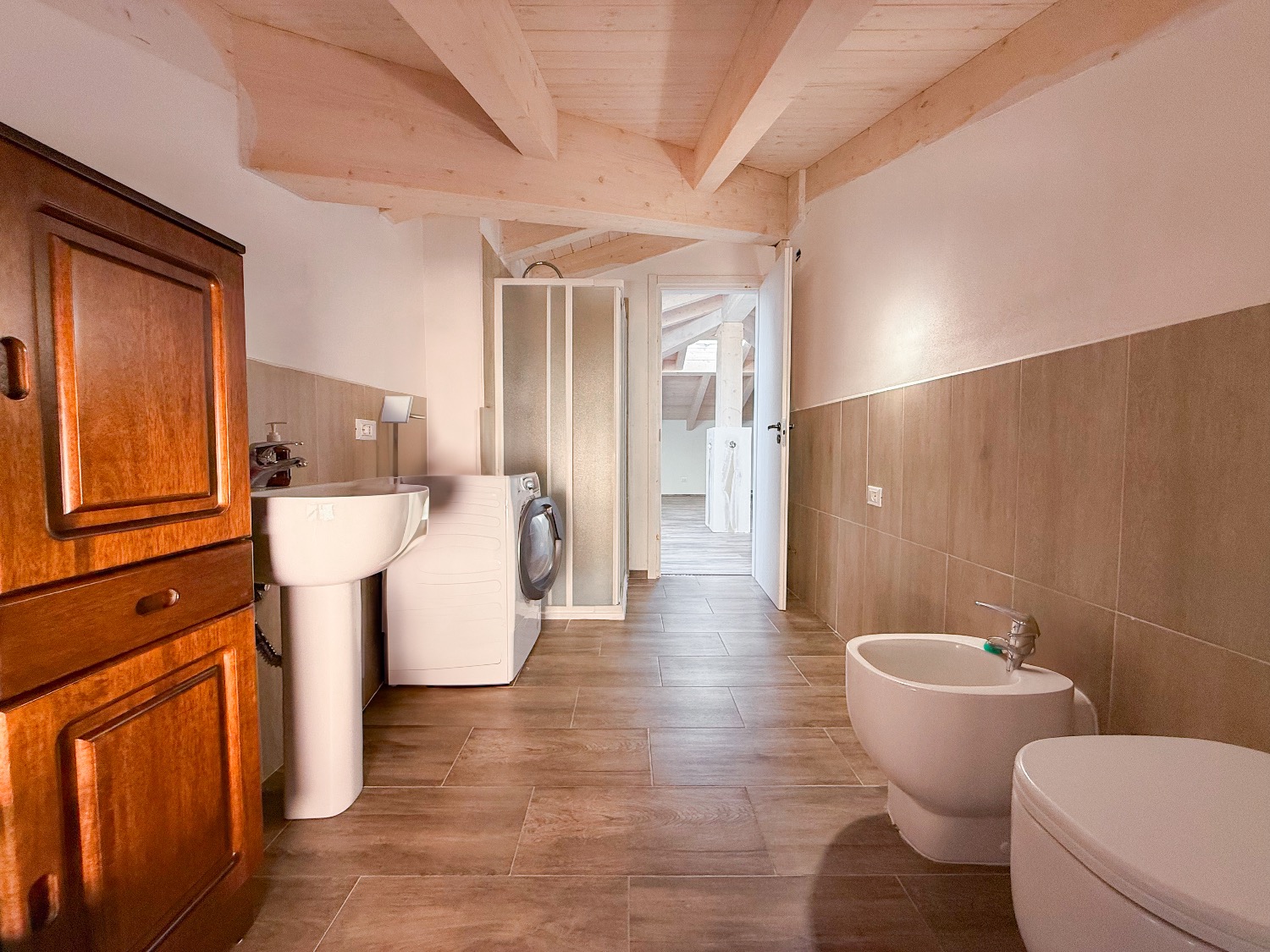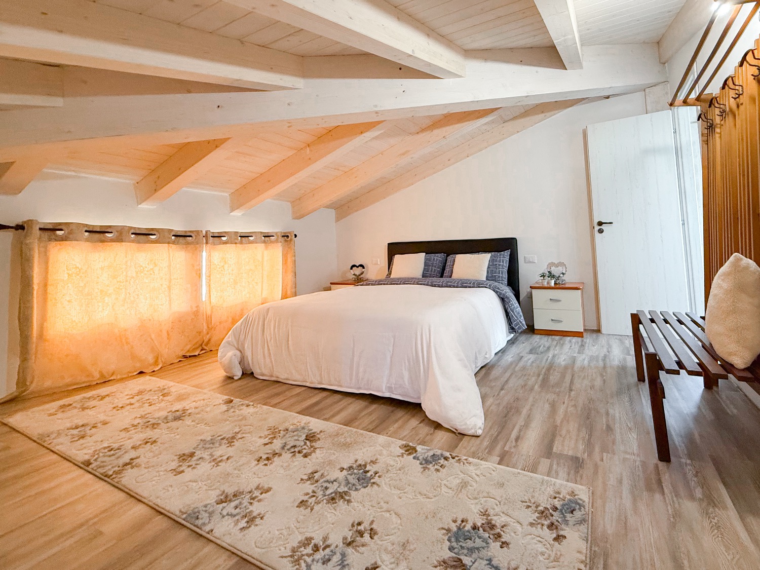 Una scala interna dal design moderno conduce al piano superiore, dove un unico e spazioso vano mansardato è stato sapientemente suddiviso per creare due ulteriori camere, una zona hobby/studio e un comodo secondo servizio igienico con area lavanderia.