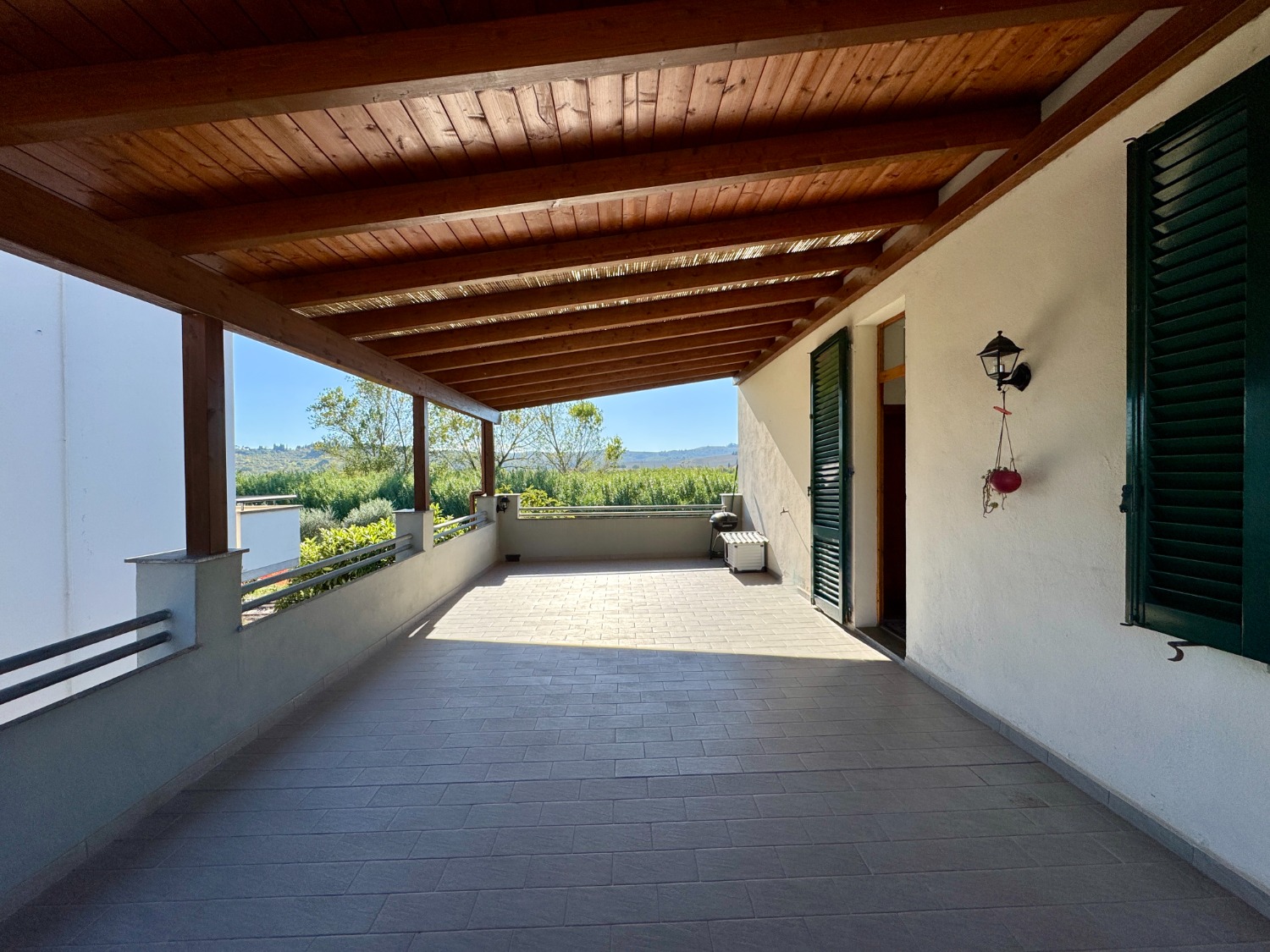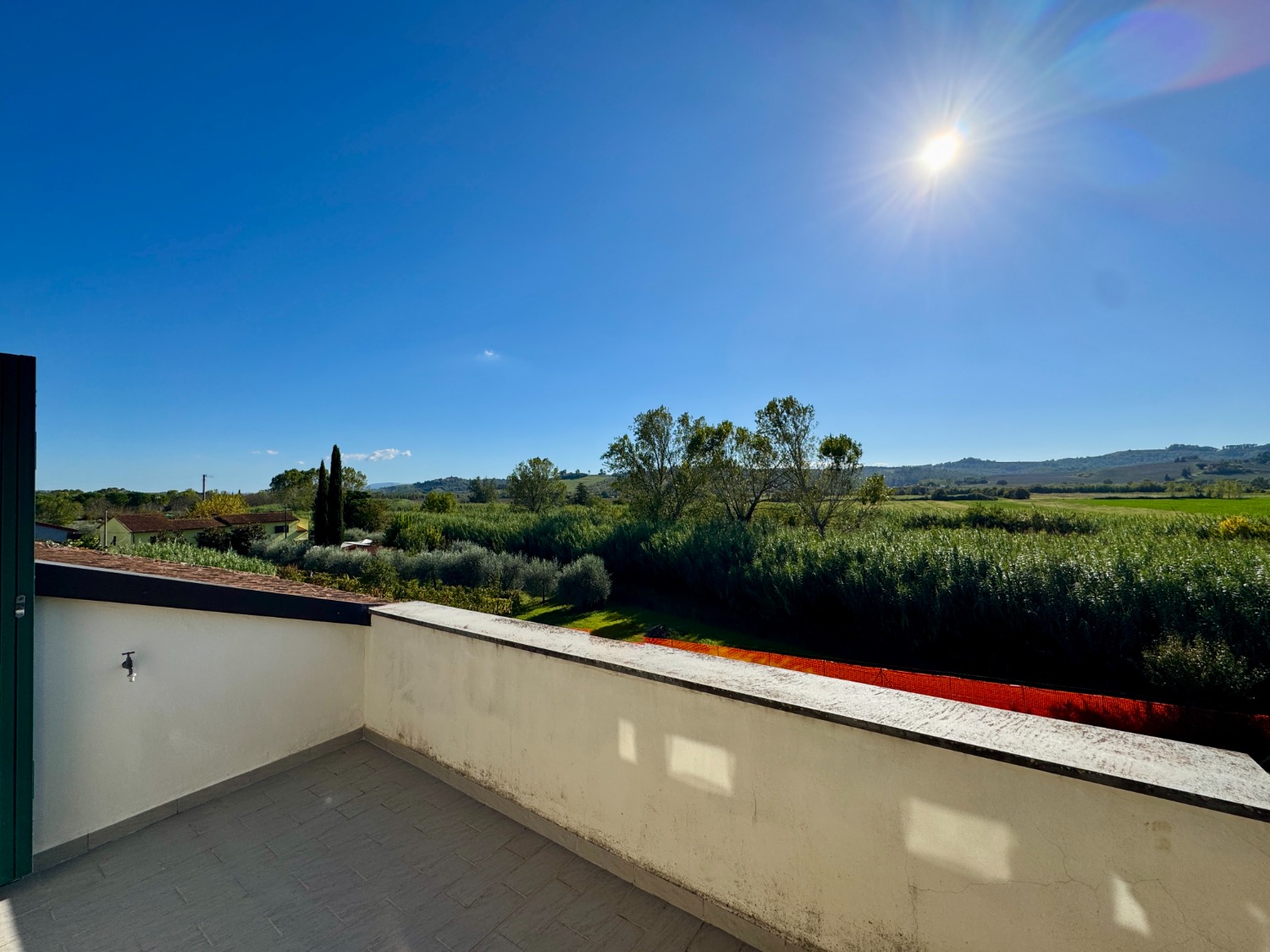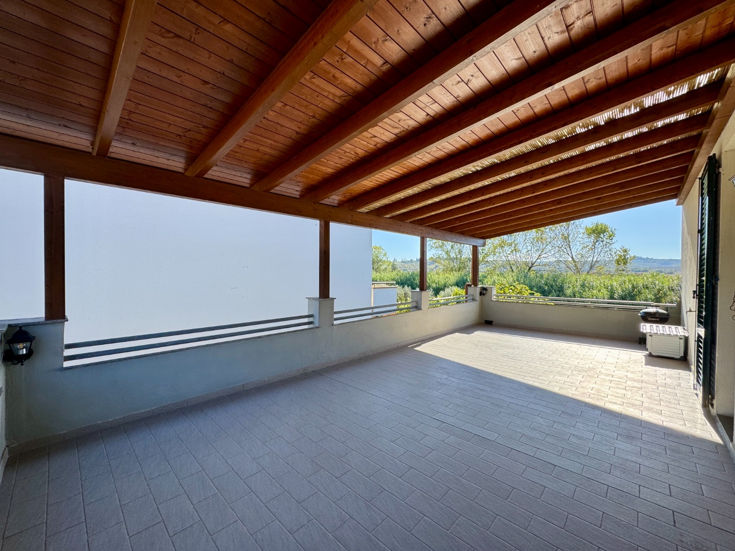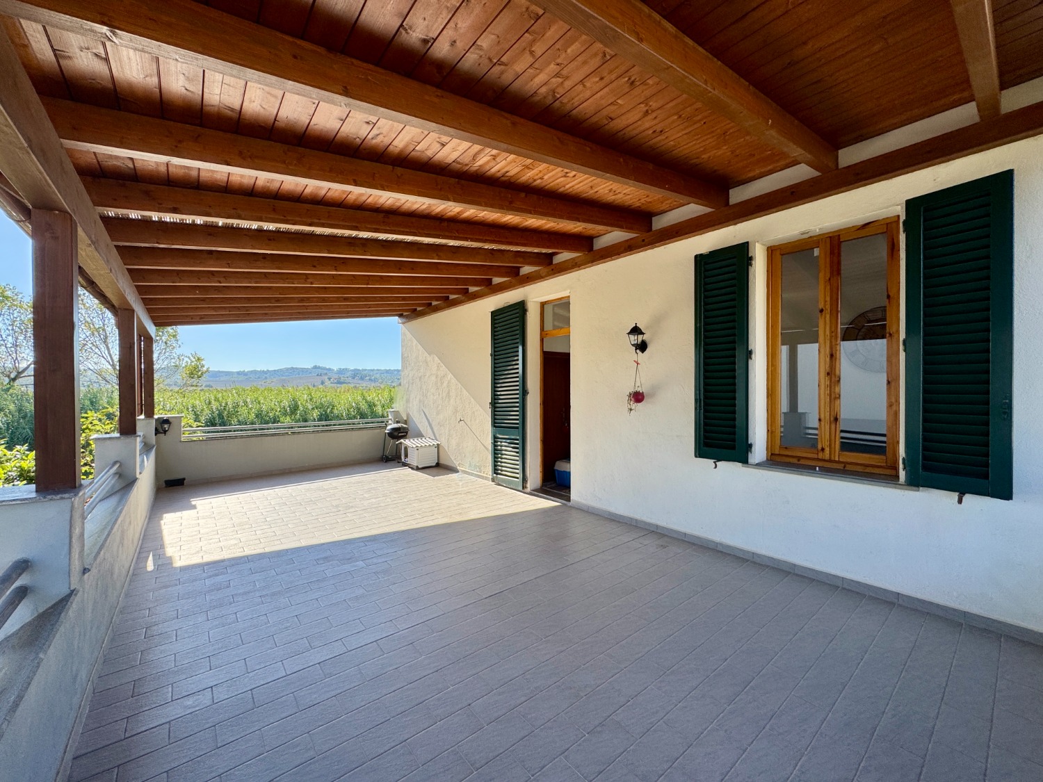 Il piano primo, collegato da elegante scala interna, ospita un secondo appartamento indipendente composto da soggiorno, cucina con balcone, due camere matrimoniali e bagno. Dalla zona giorno si accede a una grande terrazza panoramica coperta, con affaccio aperto sulla campagna, ideale per cene estive e momenti conviviali.