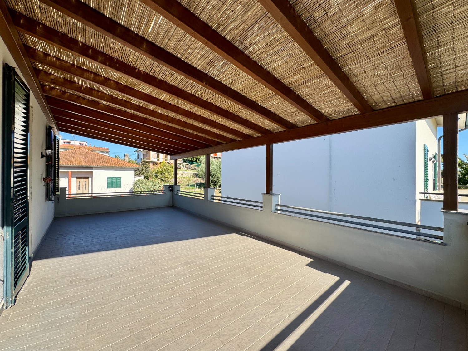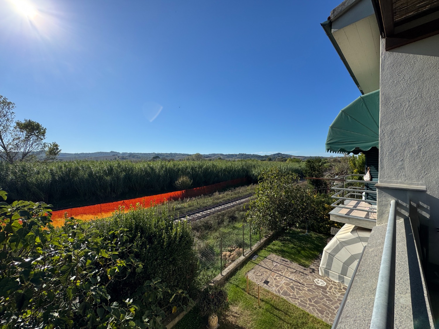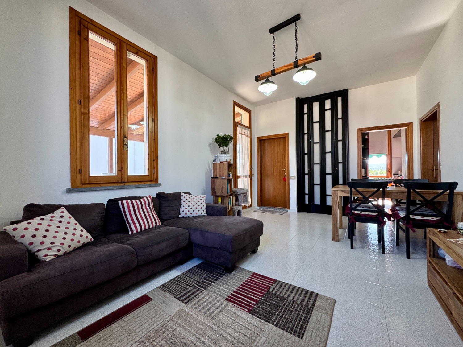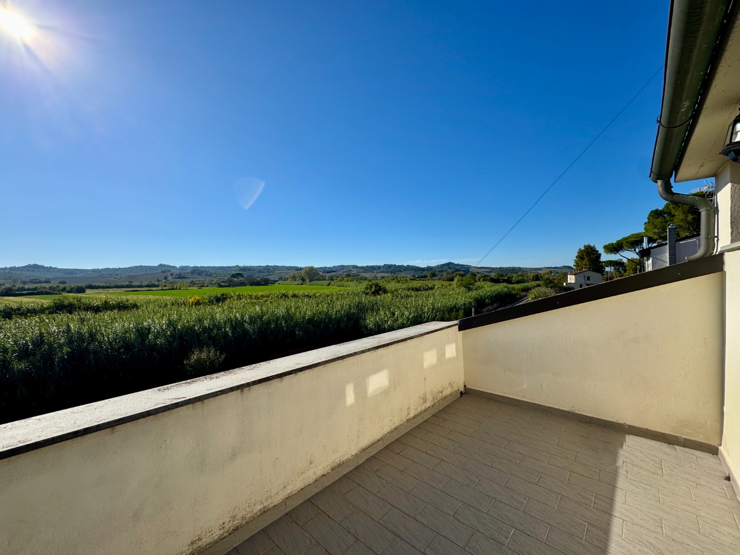 Il piano primo, collegato da elegante scala interna, ospita un secondo appartamento indipendente composto da soggiorno, cucina con balcone, due camere matrimoniali e bagno. Dalla zona giorno si accede a una grande terrazza panoramica coperta, con affaccio aperto sulla campagna, ideale per cene estive e momenti conviviali.