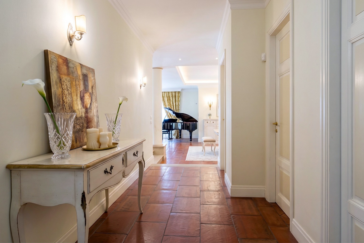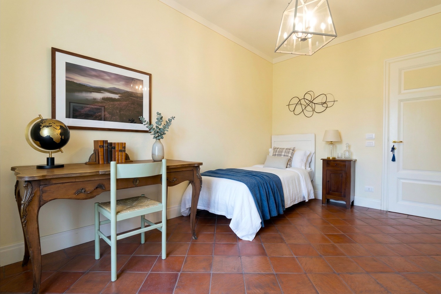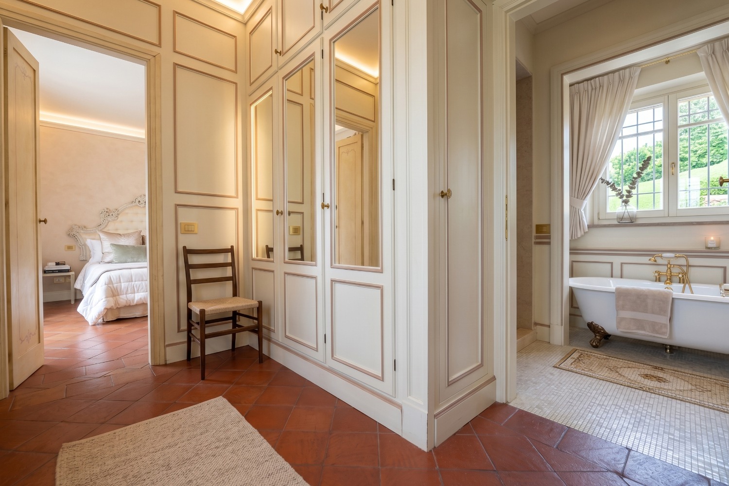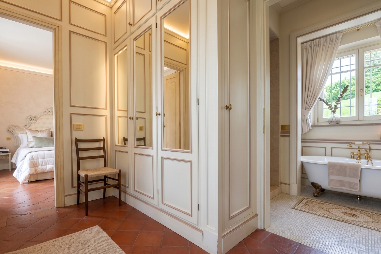 La zona notte, ben disimpegnata, ospita una camera matrimoniale con elegante guardaroba su misura a specchio e bagno en suite, uno studio, due ulteriori camere e doppi servizi, ideali per famiglia e ospiti.