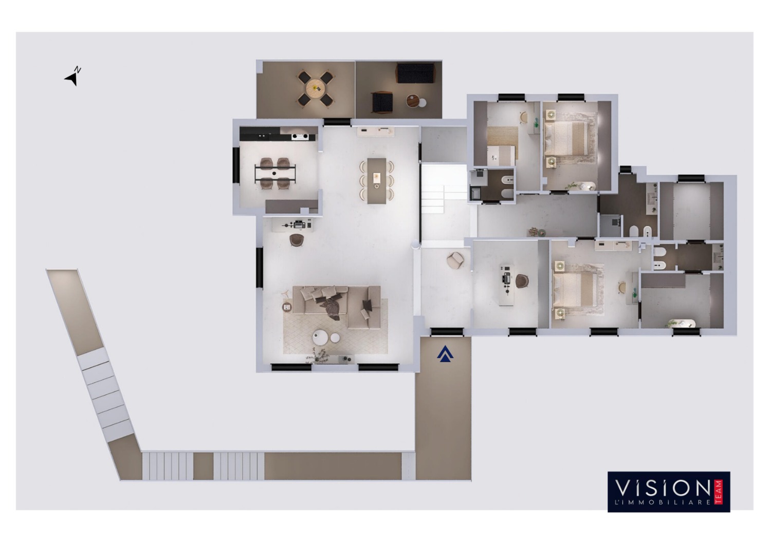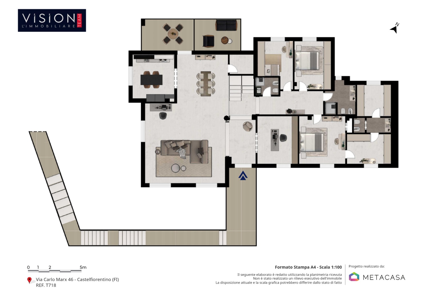 Le immagini possono includere rendering indicativi di complementi d’arredo realizzati con IA, utili per valorizzare e immaginare le potenzialità degli spazi.