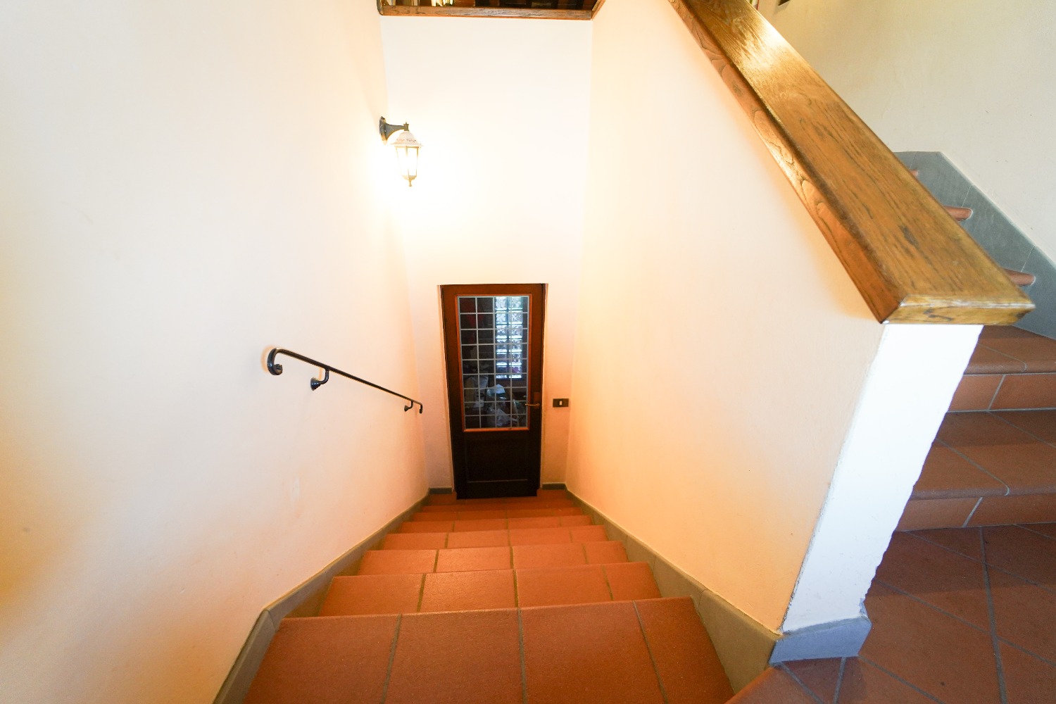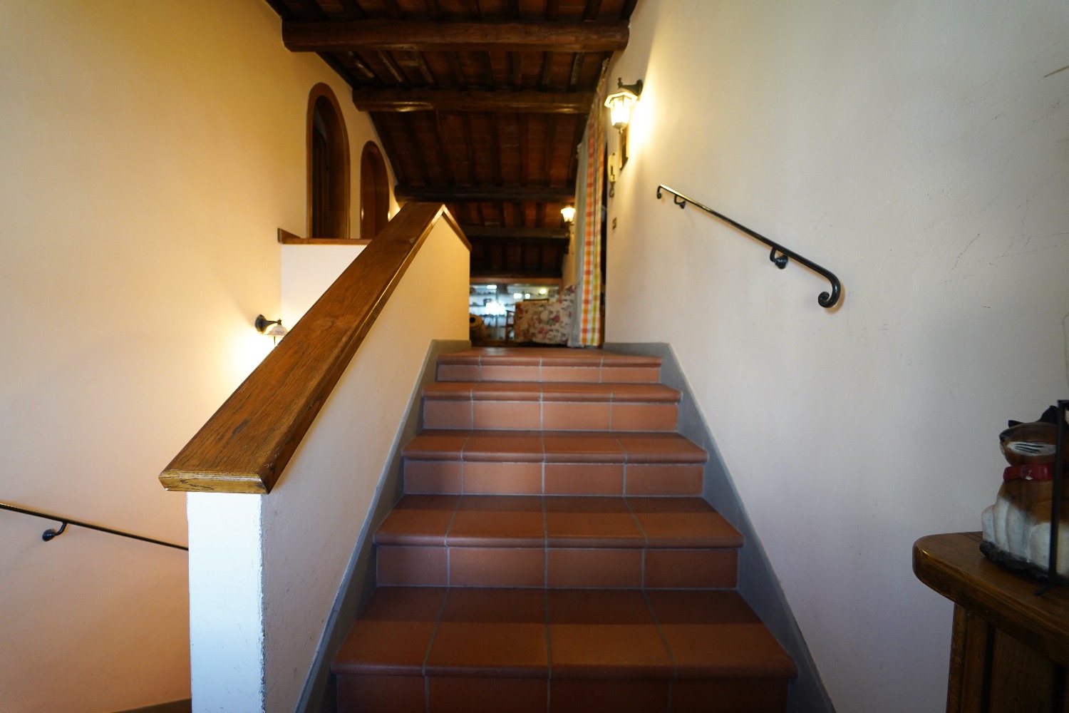 Una scala interna conduce all’ampia terrazza panoramica, perfetta per cene e momenti di relax all’aperto durante la bella stagione.